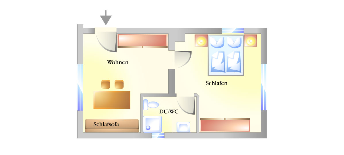 In unseren Appartements, die ca. 25qm groß sind, nutzen Sie ein großes Wohnzimmer mit TV und Telefon, eine Schlafstube, die im Landhausstil eingerichtet ist und ein kleines Bad mit Dusche und WC.