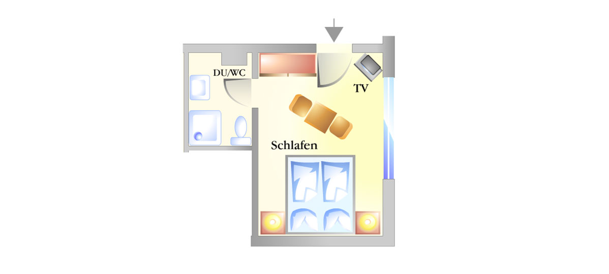 Ein kleines Doppelzimmer mit Telefon, TV und Mini-Bar, sowie einem kleinen Bad mit WC und Dusche, lädt Sie zum gemütlichen Verweilen ein.